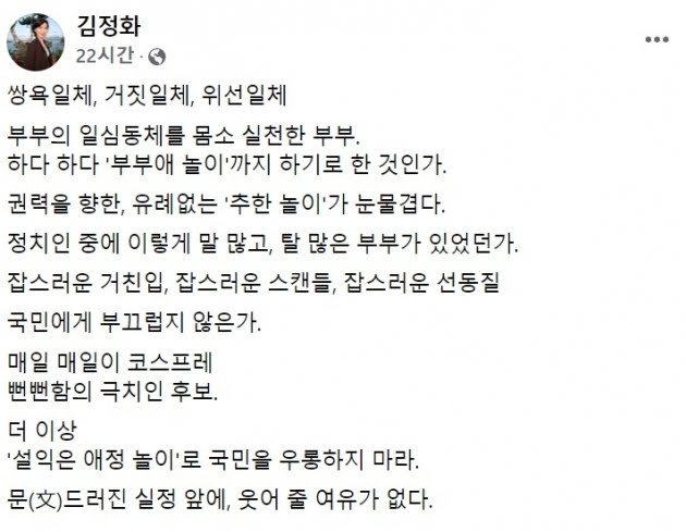 이어 "쌍욕일체, 거짓일체, 위선일체 등 부부의 일심동체를 몸소 실천한 부부"라며 "권력을 향한 유례없는 추한 놀이가 눈물겹다"고 덧붙였다.