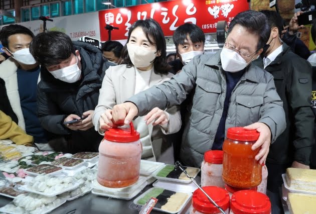 고향인 안동을 방문한 이재명 더불어민주당 대선 후보와 배우자 김혜경 씨가 11일 경북 안동시 안동 중앙신시장을 찾아 안동식혜를 구입하고 있다. [연합]