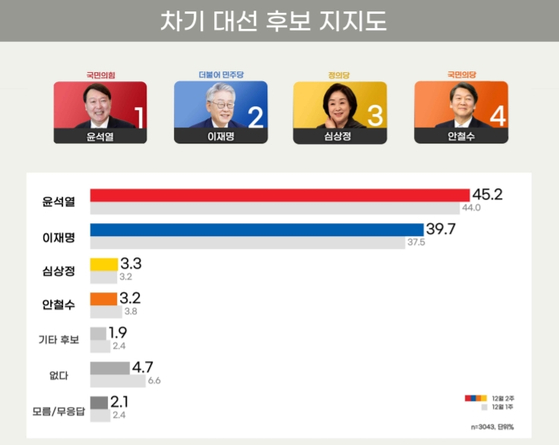 대선 후보 지지도 조사(이재명·윤석열·심상정·안철수)에서 이재명 후보는 지난주보다 2.2%포인트 오른 39.7%로 나타났습니다. 윤석열 후보는 1.2%포인트 오른 45.2%입니다.