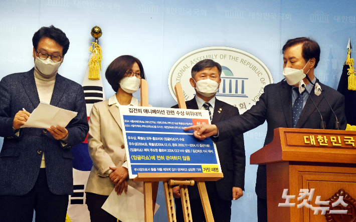 더불어민주당 안민석, 도종환, 권인숙, 서동용 의원은 15일 국회 소통관에서 국민의힘 윤석열 대선후보 부인 김건희 씨의 허위 이력서 와 수상 경력에 대한 거짓 해명에 대한 반박 기자회견을 하고 있다. 윤창원 기자