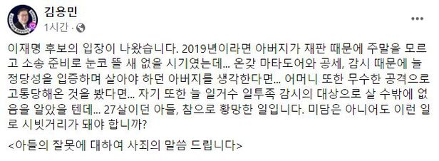 그리고 오전 9시. 김씨는 새글을 통해 “이 후보의 입장이 나왔다. 2019년이라면 아버지가 재판 때문에 주말을 모르고 소송 준비로 눈코 뜰 새 없을 시기였는데. 온갖 마타도어와 공세, 감시 때문에 늘 정당성을 입증하며 살아야 하던 아버지를 생각한다면. 어머니 또한 무수한 공격으로 고통당해온 것을 봤다면. 자기 또한 늘 일거수일투족 감시의 대상으로 살 수밖에 없음을 알았을 텐데. 27살이던 아들, 참으로 황망한 일이다. 미담은 아니어도 이런 일로 시빗거리가 돼야 하냐”며 마치 도박이 큰 문제가 되지 않는다는 듯한 취지의 글을 남겼다.
