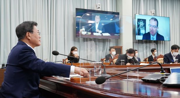문재인 대통령이 2020년 12월 28일 오후 청와대 여민관 영상회의실에서 스테판 반셀 모더나 최고경영자(CEO)와 화상 통화하고 있다./뉴시스