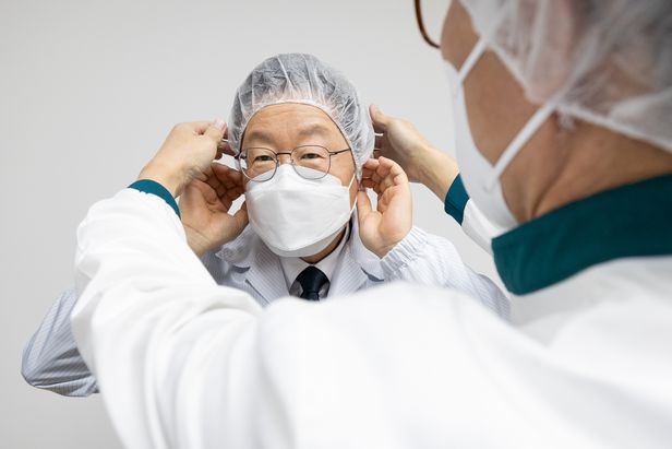 이재명 더불어민주당 대선 후보가 17일 강원 원주시 기업도시로 서울F&B 원주 공장을 방문해 방진모를 착용하고 있다. /뉴시스