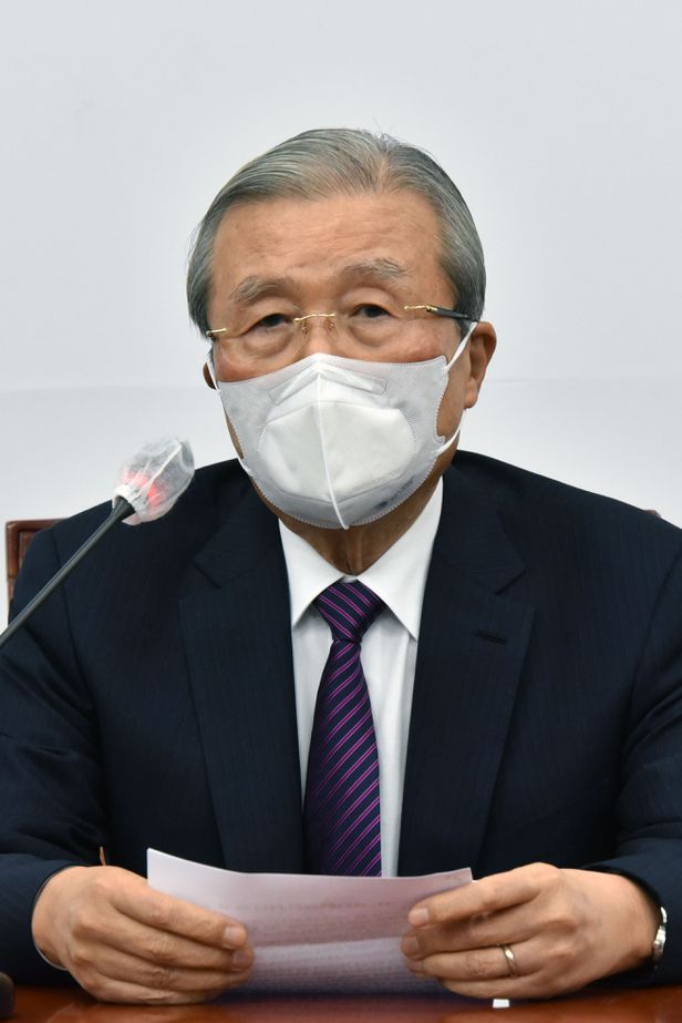 국민의힘 김종인 총괄선대위원장이 16일 서울 여의도 국회에서 코로나19 관련 기자간담회를 하고 있다. /뉴시스