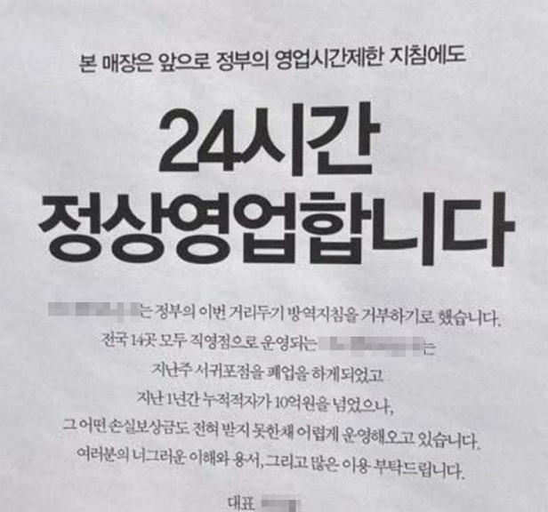 적자 10억 넘어, 방역지침 거부24시간 영업 선언한 카페