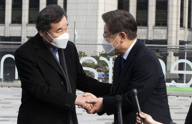더불어민주당 이재명 대선후보와 이낙연 전 대표가 23일 중구 달개비 식당에서 열린 오찬 회동후 인사를 하고 있다./이덕훈 기자
