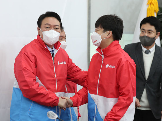 지난 7일 오전 서울 국회의사당에서 열린 국민의힘 중앙 선대위 1차 회의에서 윤석열 대선 후보가 이준석 당 대표와 악수를 나누고 있다. 2021.12.7/뉴스1 © News1