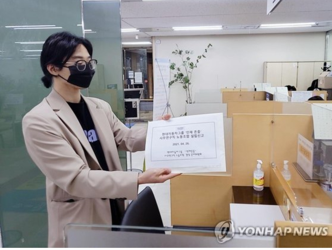 김건우 현대차그룹 사무직 노조위원장이 지난 4월 26일 서울지방고용노동청에 노조 설립신고서를 제출하고 있다. [연합뉴스]
