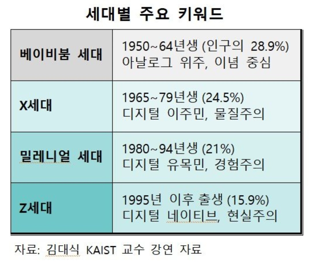 이 얘기를 디지털에 대입하면 호모 사피엔스의 새로운 장(章)이 열린다. 6·25전쟁 이후 태어난 베이비부머와 비교해 X세대(1965~79년생)는 그나마 디지털을 ‘경험’했다.〈그래픽 참조〉 밀레니얼 세대와 Z세대를 합쳐서 부르는 MZ세대는 디지털 문화에 녹아 있다.