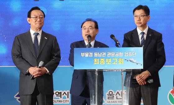 2019년 4월 부산시청 대회의실에서 열린 '부산·울산·경남 동남권 관문공항 검증단 최종보고회'에 참석한 송철호 울산시장, 오거돈 당시 부산시장, 김경수 당시 경남도지사(왼쪽부터)가 기자들의 질문에 답하고 있다. 송봉근 기자