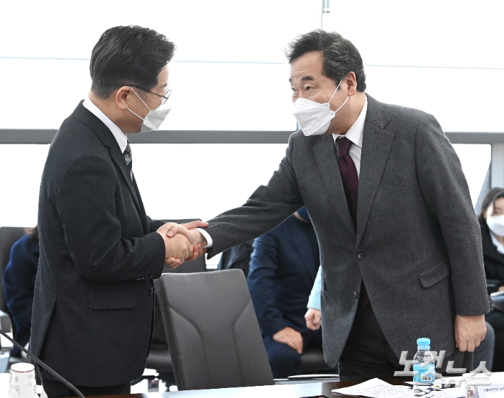 이재명 더불어민주당 대선후보와 이낙연 국가비전·국민통합위원회 공동위원장이 29일 서울 광진구 한국사회보장정보원을 방문해 악수하고 있다. 윤창원 기자