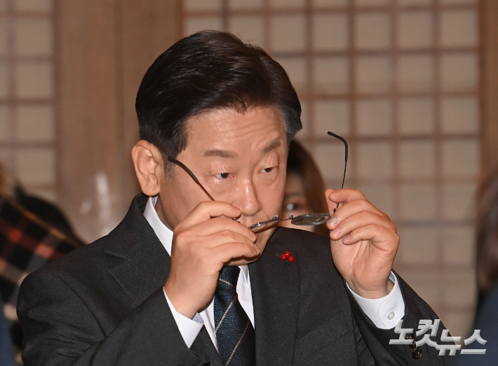 30일 오전 이재명 더불어민주당 대선후보가 한국신문방송편집인협회 주최 토론회에서 입장하며 안경을 고쳐쓰고 있다. 윤창원 기자
