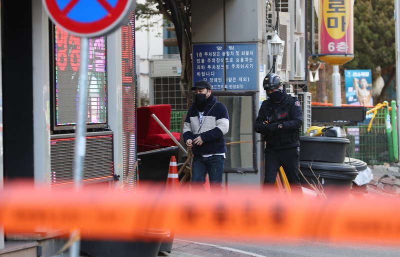 2일 오전 붕괴 우려로 긴급대피령이 내려진 경기도 일산 마두역 인근 상가건물 인근 도로에 지반침하 현상이 일어나있다. 지하 3층, 지상 7층 규모의 해당건물은 12월 31일 오전 11시 34분께 건물지하 3층 기둥이 일부 파손됐다는 사고신고가 접수됐고 상가 입주민과 주변 건물 상인 등 300여명이 긴급대피했다. 사진 뉴스1