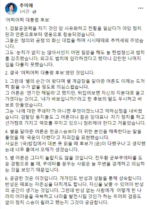 이와 관련 추미애 전 법무부 장관도 5일 자신의 페이스북에 '어찌어찌 대통령 후보'라는 제목의 글을 올리고 윤 후보에 대해 "검찰공권력을 자기 것인 양 사유화하고 전횡을 일삼다가 야당 정치판과 언론으로부터 영웅으로 칭송됐다"고 평가했다.