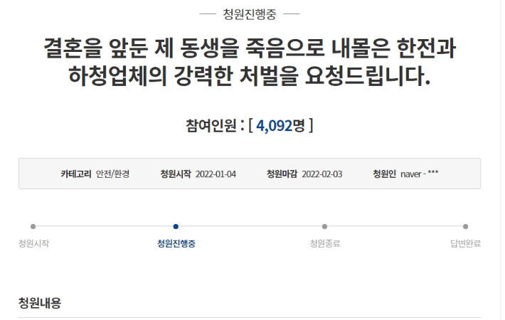결혼을 앞둔 제 동생을 죽음으로 내몰은 한전과 하청업체의 강력한 처벌을 요청드립니다. > 대한