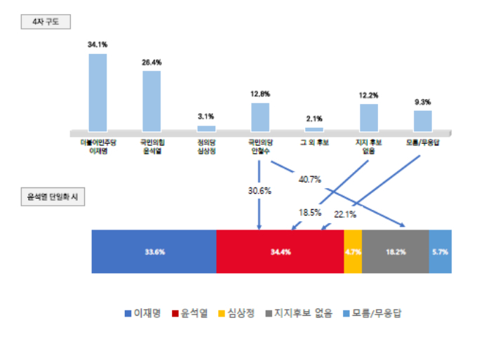 야권 단일화 가상대결시 尹 34.4%-李 33.6%, 安 42.3%-李 28.9%