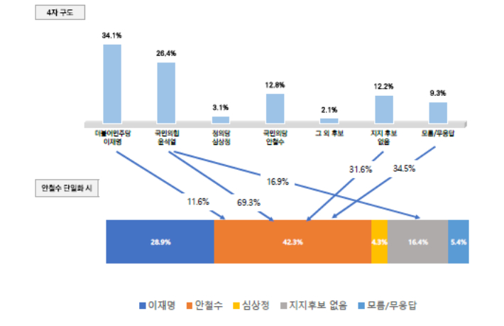 반면 안 후보로 단일화가 이뤄질 경우에는 다자 구도에서 윤석열 후보를 선택한 응답자의 69.3%가 안철수 후보를 지지로 이동했고, 지지 후보 없음에서 31.6%, 모름·무응답에서 34.5%가 지지 후보를 안 후보로 바꿀 것으로 조사됐다. 특히 이재명 후보를 지지했던 응답자의 11.6%도 안 후보 지지로 돌아섰다.
