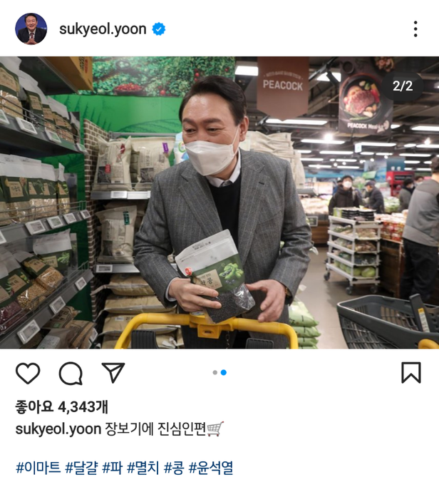 윤석열 국민의힘 대선 후보가 8일 이마트 이수점에서 장을 본 뒤 인스타그램에 사진을 올렸다. /인스타그램