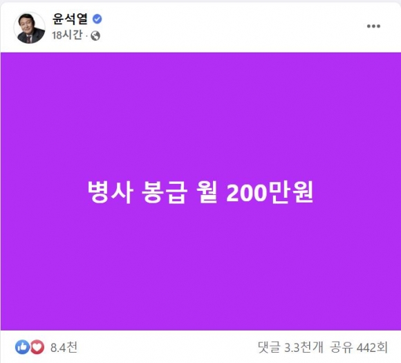앞서 윤 후보는 지난 9일 오후 페이스북을 통해 “병사 봉급 월 200만원” 10자를 적으며 세번째 한 줄 단문 공약을 내놨다. 지난 6일 ‘성범죄 처벌 강화 무고죄 처벌 강화’, 7일 ‘여성가족부 폐지’에 이은 것이다.