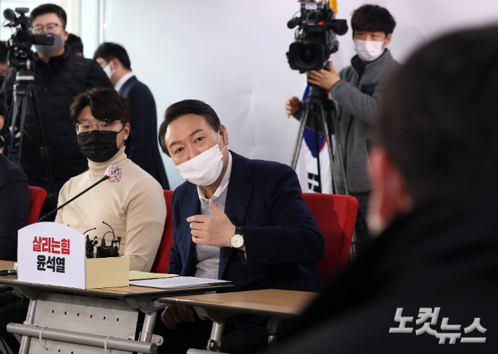 국민의힘 윤석열 대선후보가 6일 서울 여의도 당사에서 열린 '변화와 쇄신' 청년보좌역들과의 간담회에서 질의에 답하고 있다. 윤창원 기자