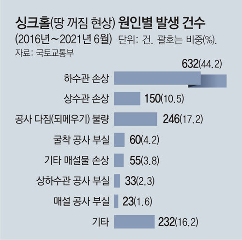 2019년 서울 영등포구 여의도의 한 공사 현장에서 싱크홀 사고가 발생해 노동자 1명이 숨졌고, 앞선 2014년에는 서울 송파구 석촌호수 주변에서 싱크홀이 잇따라 발생해 시민들을 공포로 몰아넣었다. 땅 꺼짐 사고가 되풀이되는 지역 주민들은 발밑이 불안하다. 근본적 대책 마련이 요구되는 이유다.