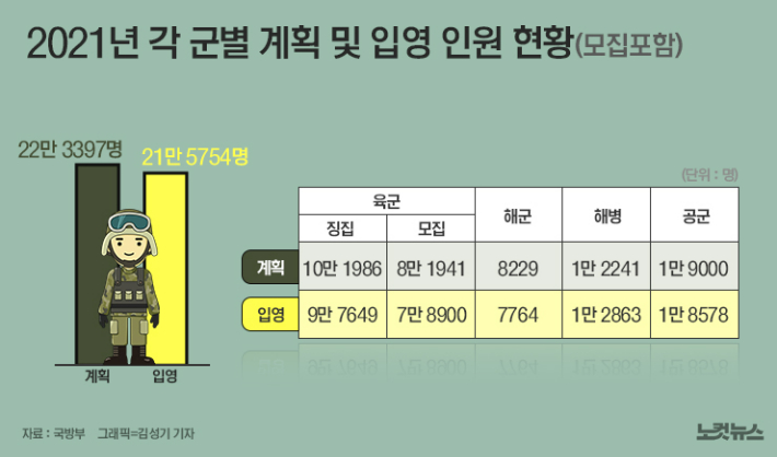 ◆ 김광일> 인구 절벽 문제가 있습니다. 그러니까 출산율 저하로 징집 대상 자체가 계속 줄어들고 있는데요. 이번에 저희가 국방부에서 받은 자료를 보면 장교, 부사관을 빼고 지난해 병으로 입대한 인원이 22만 명 정도가 되거든요. 여기에 재작년에 입대해서 아직 남아 있는 고참들까지 포함하면 30만 명 안팎으로 지금 추산이 됩니다.