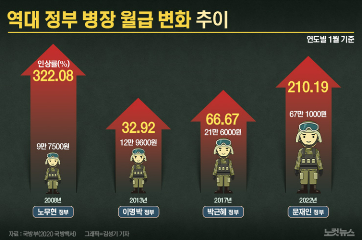 ◆ 김광일> 그거는 인사혁신처 규정을 확인해 봤습니다. 제일 많이 받는 병장 기준으로 2002년에는 2만 1900원이었는데요. 노무현 정부에서 이걸 3배 이상 올렸고요. 이명박 정부에서 33%, 박근혜 정부가 67%를 올렸고요. 이거를 문재인 정부가 최근에 2배 이상 올렸습니다.