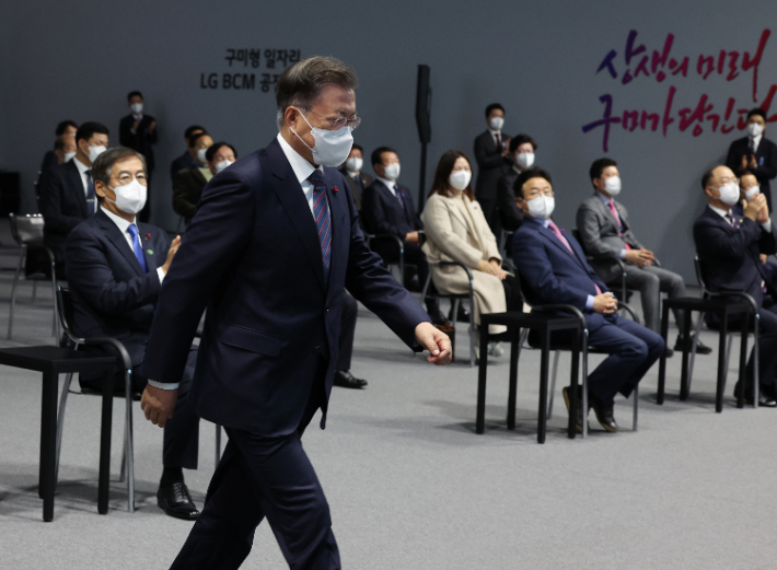 문재인 대통령이 11일 오전 경북 구미시 구미코에서 열린 구미형 일자리 LG BCM 공장 착공식에서 연단으로 향하고 있다. 연합뉴스