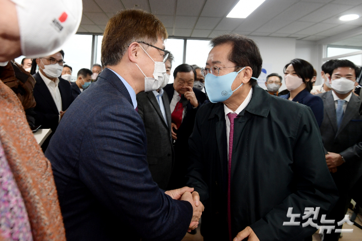 지난해 11월 8일 국민의힘 홍준표 의원이 서울 영등포구 여의도 BNB타워에서 열린 JP희망캠프 해단식에서 인사말을 마치고 최재형 전 감사원장과 악수하고 있다. 윤창원 기자