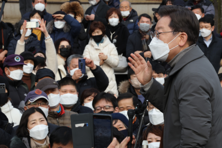 더불어민주당 이재명 대선후보가 22일 서울시 송파구 석촌호수에서 즉석연설을 통해 지지를 호소하고 있다. 연합뉴스