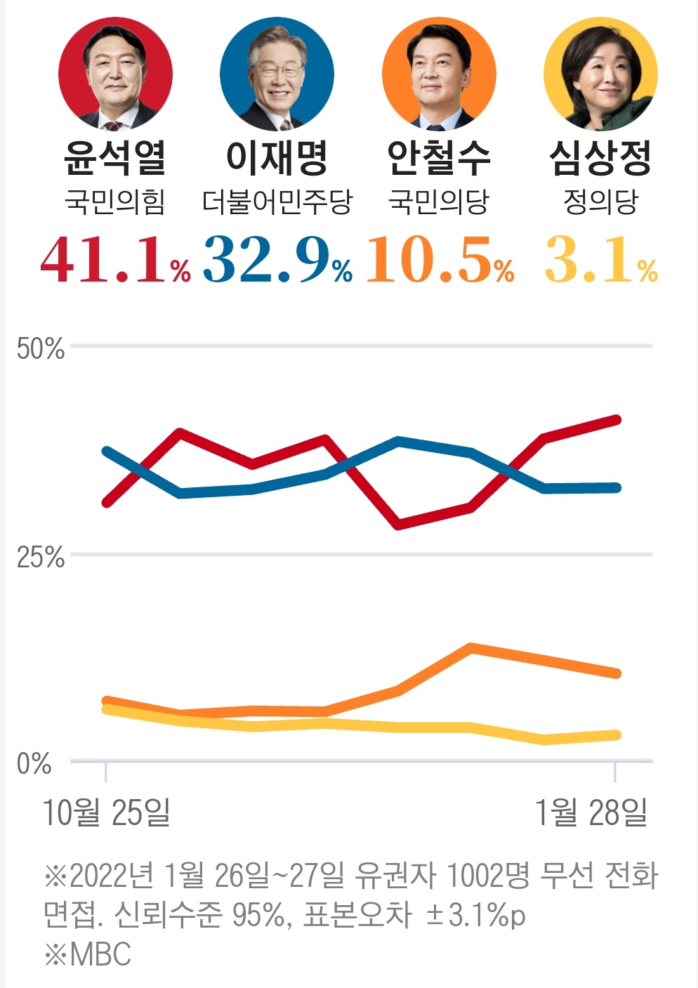 조선일보·TV조선이 칸타코리아에 의뢰해 지난 4~5일 실시한 대통령 후보 4자 대결 조사 결과, 윤석열 국민의힘 후보는 35.0%, 이재명 더불어민주당 후보가 31.0%였다. 안철수 국민의당 후보는 12.1%, 심상정 정의당 후보는 2.9%였고 지지 후보가 ‘없다·모르겠다’는 부동층은 17.4%였다.