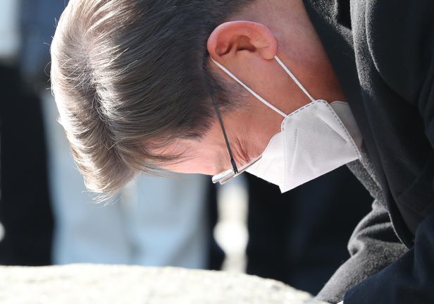 이재명 더불어민주당 대선 후보가 6일 오후 경남 김해시 봉하마을 故노무현 전 대통령 묘역을 찾아 너럭바위를 만지며 눈물을 흘리고 있다./김동환 기자