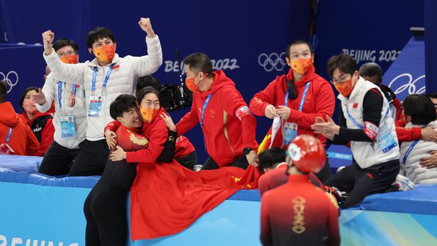 7일 중국 베이징 수도실내체육관에서 열린 2022 베이징 동계올림픽 쇼트트랙 남자 1000m 결승에서 중국 런쯔웨이가 우승을 차지해 김선태 감독(맨 오른쪽)과 안현수 코치(왼쪽 두번째)가 환호하고 있다./뉴스1