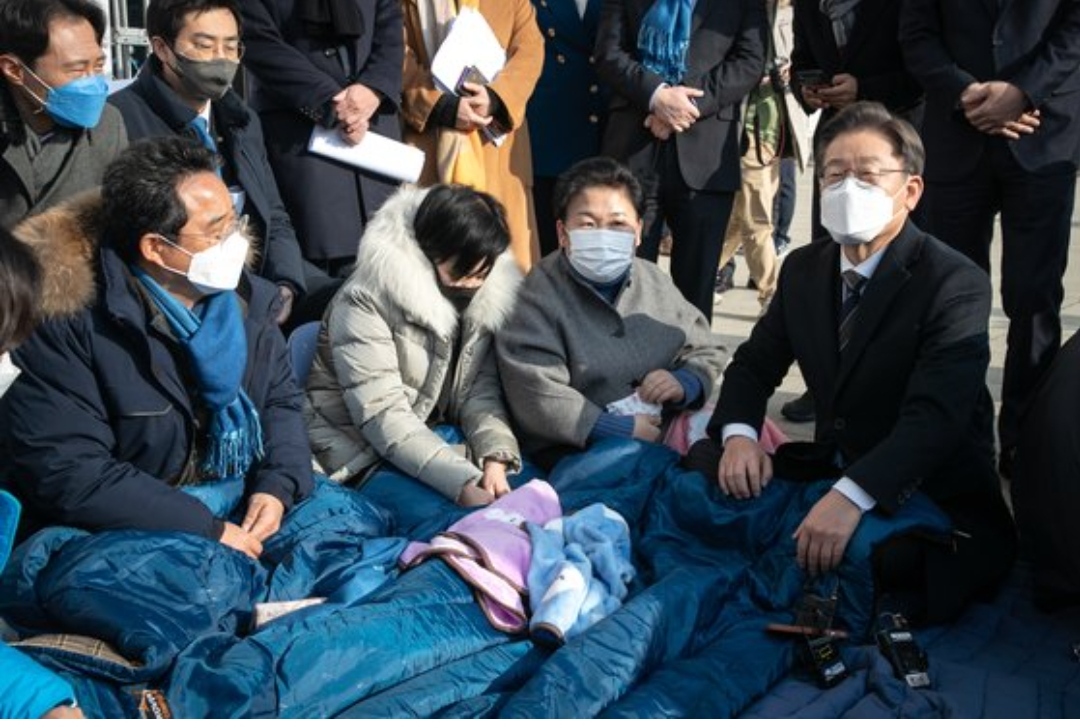 이재명 더불어민주당 대선후보(오른쪽)가 8일 오미크론 확산 긴급점검회의에 참석하기 전 국회 본청 앞 '추경 증액' 농성장을 방문해 이야기를 나누고있다. 김상선 기자