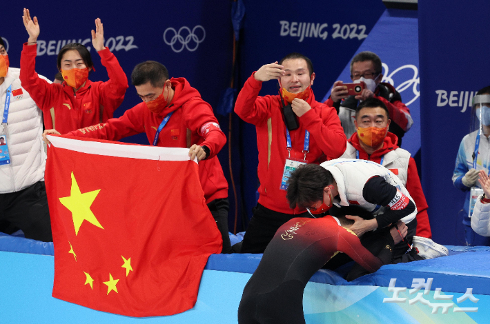 2022 베이징동계올림픽 쇼트트랙 남자 1,000m 종목에서 금메달을 획득한 중국 런쯔웨이가 7일 중국 베이징 캐피털 인도어 스타디움에서 경기를 마친 뒤 김선태 감독의 축하를 받고 있다. 베이징(중국)=박종민 기자