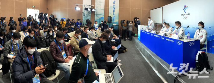 8일 중국 2022 베이징동계올림픽 메인미디어센터에서 열린 쇼트트랙 편파판정에 대한 선수단장 긴급 기자회견이 열리고 있다. 베이징(중국)=박종민 기자
