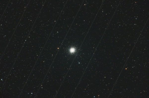 지난해 6월 22일 21시 13분 충북 괴산에서 한국천문연구원 박영식 선임연구원이 촬영한 구상성단 M13(가운데)과 대각선 선 모양으로 나타난 스타링크 8기의 궤적들./한국천문연구원