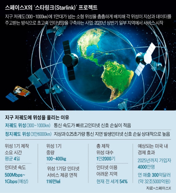 스타링크는 2020년대 중반까지 저궤도 소형위성 1만2000기를 쏘아 올려 지구 전역에서 이용 가능한 초고속 인터넷 서비스를 구축하는 사업이다. 스타링크 위성은 지구 상공 210㎞의 저궤도를 돈다. 이 궤도는 다른 통신위성보다 훨씬 고도가 낮다. 덕분에 통신 속도가 빠르고 인터넷 신호 손실도 적다. 스페이스X는 현재까지 2000여 위성을 발사했고, 북미 등 14개 나라에서 위성 인터넷 베타 서비스 사업을 진행하고 있다.