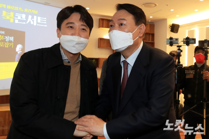 윤석열 국민의힘 대선후보와 이준석 대표가 9일 오후 서울 여의도 인근의 카페에서 열린 김근식의 대북정책 바로잡기 출간기념 북콘서트에서 기념촬영 후 손을 잡고 있다. 윤창원 기자