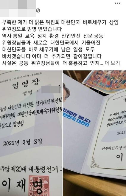 남씨는 페이스북에 ‘이재명 대통령 당선 발원 108배 100일 기도’ 인증 사진을 주기적으로 올리고 있다. 4일에는 “부족한 제가 더밝은미래위원회 대한민국바로세우기 상임위원장으로 임명받았다”라며 이재명 후보가 발행한 것으로 나와있는 임명장 사진을 공개했다.