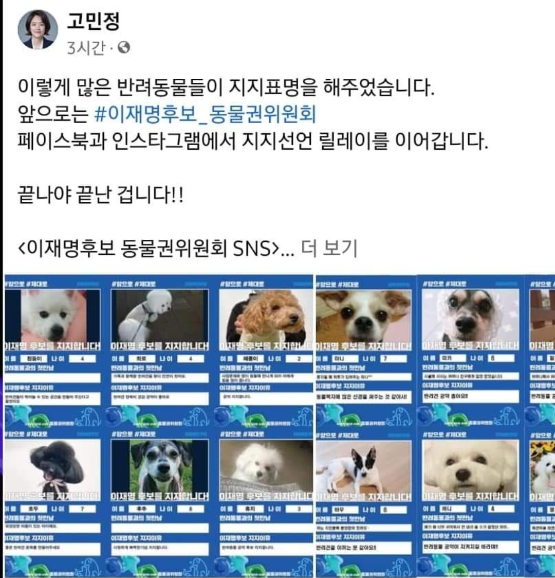 민주당 선대위에서 동물권위원회 공동위원장을 맡고 있는 고민정 의원은 이날 “이렇게 많은 반려동물들이 지지표명을 해줬다”며 ‘흰둥이’ ‘밀크’ ‘뭉치’ ‘초코’ ‘호두’ ‘후추’ ‘만두’ ‘나나’ 같은 반려동물 60마리의 사진을 페이스북에 올렸다.