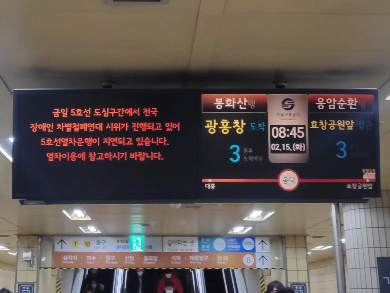 [출근길 지각 사태] 금일 5호선 도심구간에서 전국 장애인 차별철폐연대 시위가 진행되고 있어 5호선열차운행이 지연되고 있습니다. 열차이용에 참고하시기 바랍니다.
