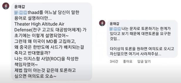 그러자 윤 의원은 자신의 의견을 반박한 네티즌 A를 태그하며 “그러면 성주에 사드가 배치될 때 중국이 (왜) 그토록 극렬하게 저항하고 한국에 대해 무역보복, 여행자 통제를 가했을까 설명해달라”고 했다. ‘최대사거리 200km의 사드가 미국으로 날라가는 중국 탄도미사일을 요격한단 주장부터 입증하라’는 A의 이어진 반박에 윤 의원은 “여의도로 오세요”라고 답했다.