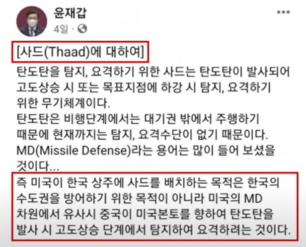 윤 의원은 지난 10일 페이스북에 글을 올려 “미국이 한국 성주에 사드를 배치하는 목적은 한국의 수도권 방어하기 위한 목적이 아니라 미국의 MD(미사일방어체계) 차원에서 유사시 중국이 미국 본토를 향하여 탄도탄을 발사 시 고도 상승 단계에서 탐지하여 요격하려는 것”이라고 했다. 국민의힘 윤석열 대통령 후보 등이 주장한 사드 추가 배치에 대한 반박 차원으로 해석됐다.