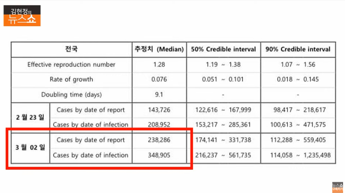 ◇ 김광일> 이게 보면 3월 2일 기준으로 봤을 때 아마 연구하신 논문의 일부인 것 같은데. "Cases by date of report"라고 해서 23만 8286명, 그리고 또 다른 항목에 "Cases by date of infection"이라고 해서 34만 8905명 이렇게 3월 2일 기준으로 2개의 수치로 예측이 되어 있는 것 같거든요.