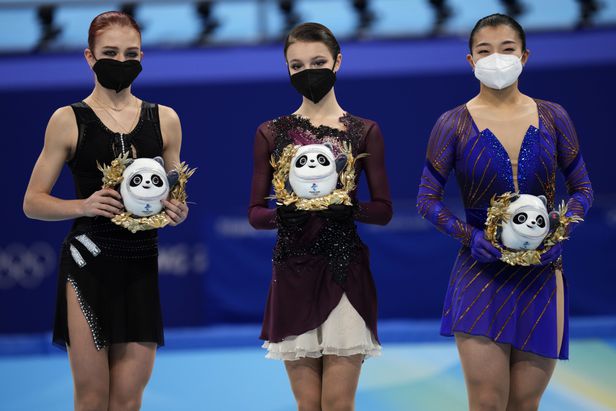 17일 오후 중국 베이징 캐피털 실내경기장에서 열린 2022 베이징 동계올림픽 피겨스케이팅 여자 싱글 프리스케이팅이 끝난 뒤, 합계 점수에서 1, 2, 3위를 차지한 선수들이 간이시상대에서 기념촬영을 하고 있다. 왼쪽부터 은메달 ROC 알렉산드라 트루소바, 금메달 ROC 안나 셰르바코바, 동메달 일본의 사카모토 가오리. /AP연합뉴스
