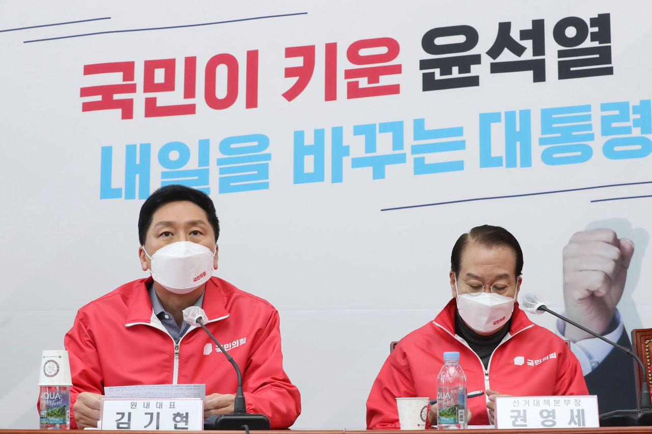 김기현 국민의힘 원내대표가 17일 오전 서울 여의도 국회에서 열린 선거대책본부-원내지도부 연석회의에서 발언하고 있다. /뉴스1