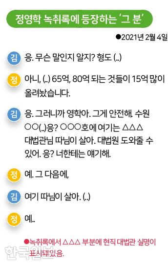 한국일보가 21일 추가 입수한 2021년 2월 4일 김씨와 정영학 회계사의 대화 녹취록을 보면, 두 사람은 경기 성남시 분당구의 한식당에서 만나 A대법관의 실명을 거론하며 이야기를 주고받았다. 김씨는 “그러니까 영학아, 그게 안전해"라며 "수원 ○○(..) ○○○호, 여기는 ○○○대법관님 따님이 살아. 대법원 도와줄 수 있어"라고 말했다. 김씨는 그러면서 "너한테는 얘기한다"며 정 회계사에게 비밀을 털어놓듯이 얘기했다. 정 회계사가 “예. 그다음에”라고 답하자, 김씨는 “여기 (A대법관) 따님이 살아. (..)”라며, A대법관 딸을 자신의 아파트에 살게 해준 것처럼 말했다.