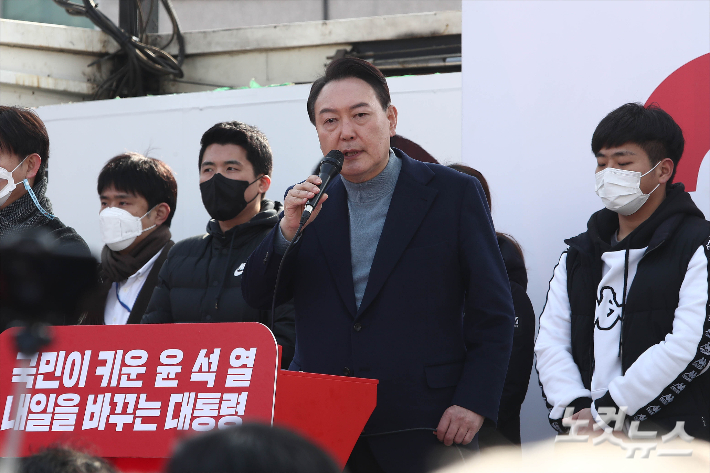 국민의힘 윤석열 대선 후보가 22일 오전 충남 당진시 당진전통시장에서 열린 '서해안시대 거점도시 당진의 선택은 윤석열!' 유세에서 지지를 호소하고 있다. 윤창원 기자