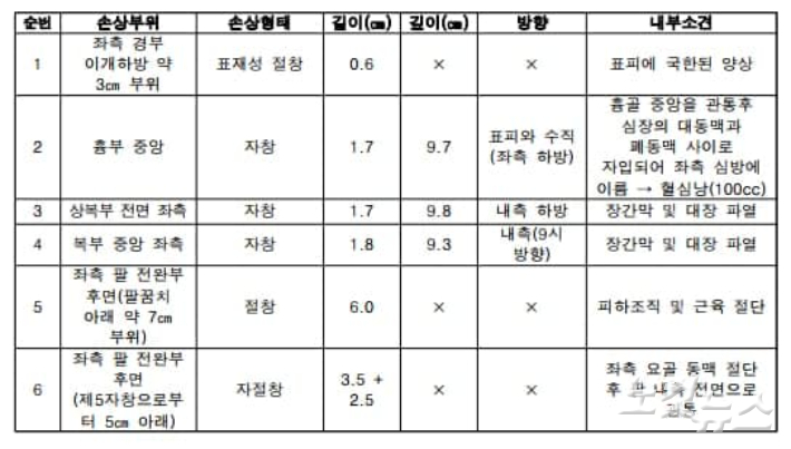 ◆ 손수호> 그렇습니다. 부검 결과, 사체에서 예리한 흉기에 의한 자창과 절창, 찔린 상처와 베인 상처가 여섯 군데 발견됐거든요. 그중 치명상은 가슴 한가운데를 관통한 깊이 9.7cm의 공격이었습니다. 지금 화면에 6개의 상처 관련된 판결문 내용들이 올라와 있는데요. 두 번째 흉부 중앙 공격이 치명상이었던 거죠. 그런데 이 두 번째 공격은, 2번 공격은요. 수술할 때 톱으로 절단할 정도로 단단한 흉골을 뚫고 심장을 찔러서 파혈에 이르게 했습니다.